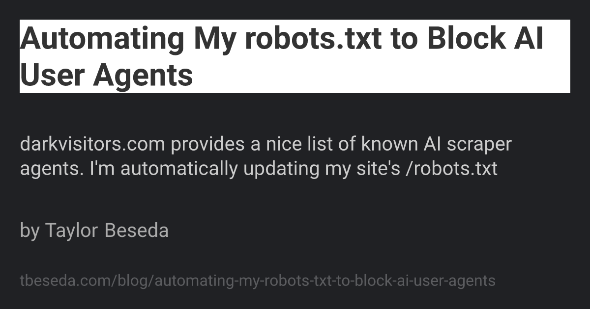 }Calling this endpoint with an article slug like: https://tbeseda.com/og-img/automating-my-robots-txt-to-block-ai-user-agents will return an image in just a few ms. The first call may take 1-2s, but subsequent requests are answered by the CloudFront cache in < 50ms!